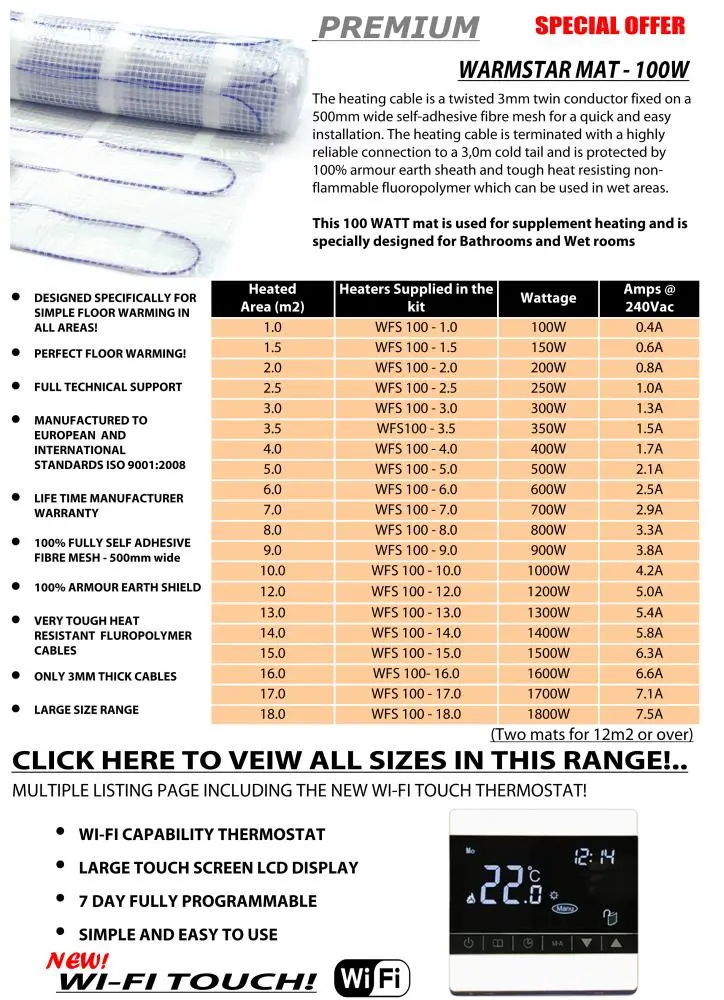 All WFS Mat systems utilise our insulated, twisted dual core heating element, protected by an armour braid and our advanced tough heat resistant fluoropolymer outer jacket. All WFS cables have a high IP rating of 67 which is suitable for use in wet areas and in conjunction with wet room systems. The heating element is attached to a 100% fully self-adhesive fibreglass mesh for rapid and superior installation without any need for priming on a clean dust free floor, ensuring zero lift in self-levelling compounds and peace of mind, no messing around with the peeling of double sided tapes. WFS heating mats come with only one power lead wire making it easy to install without raising the floor level. All WFS cables are manufactured in Sweden, world leaders in underfloor heating process and quality. WFS Cable manufacture complies and surpasses all UK and European standards and requirements.