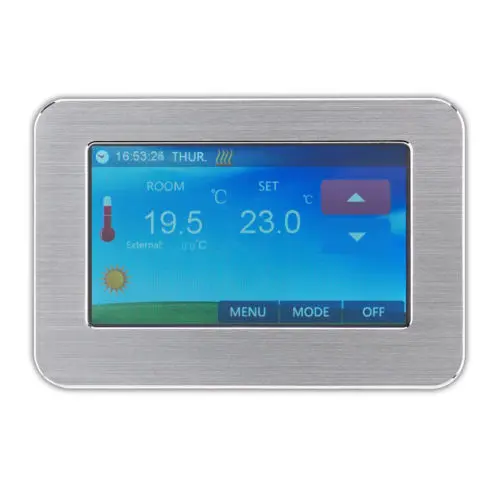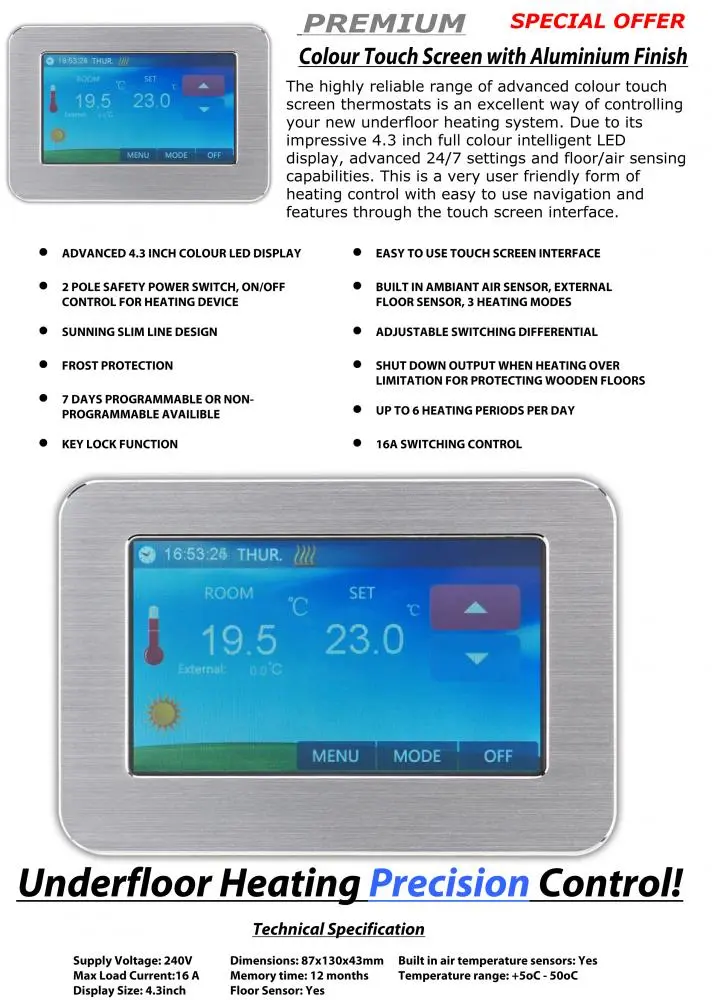 Programmable Touchscreen Thermostat that is ultra-compact and provides precise control and is easily configured to control the temperature and timings for most Heating systems.